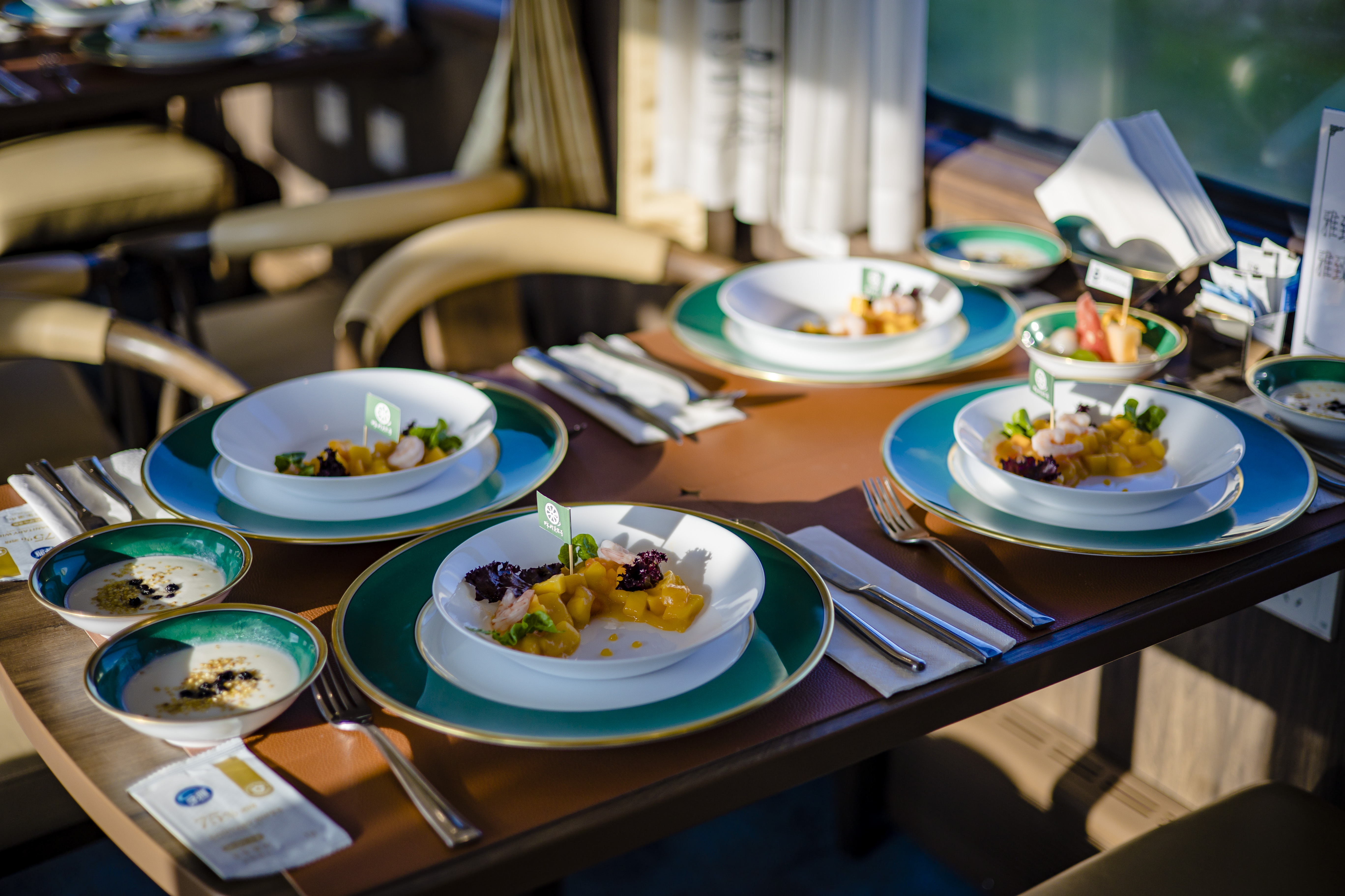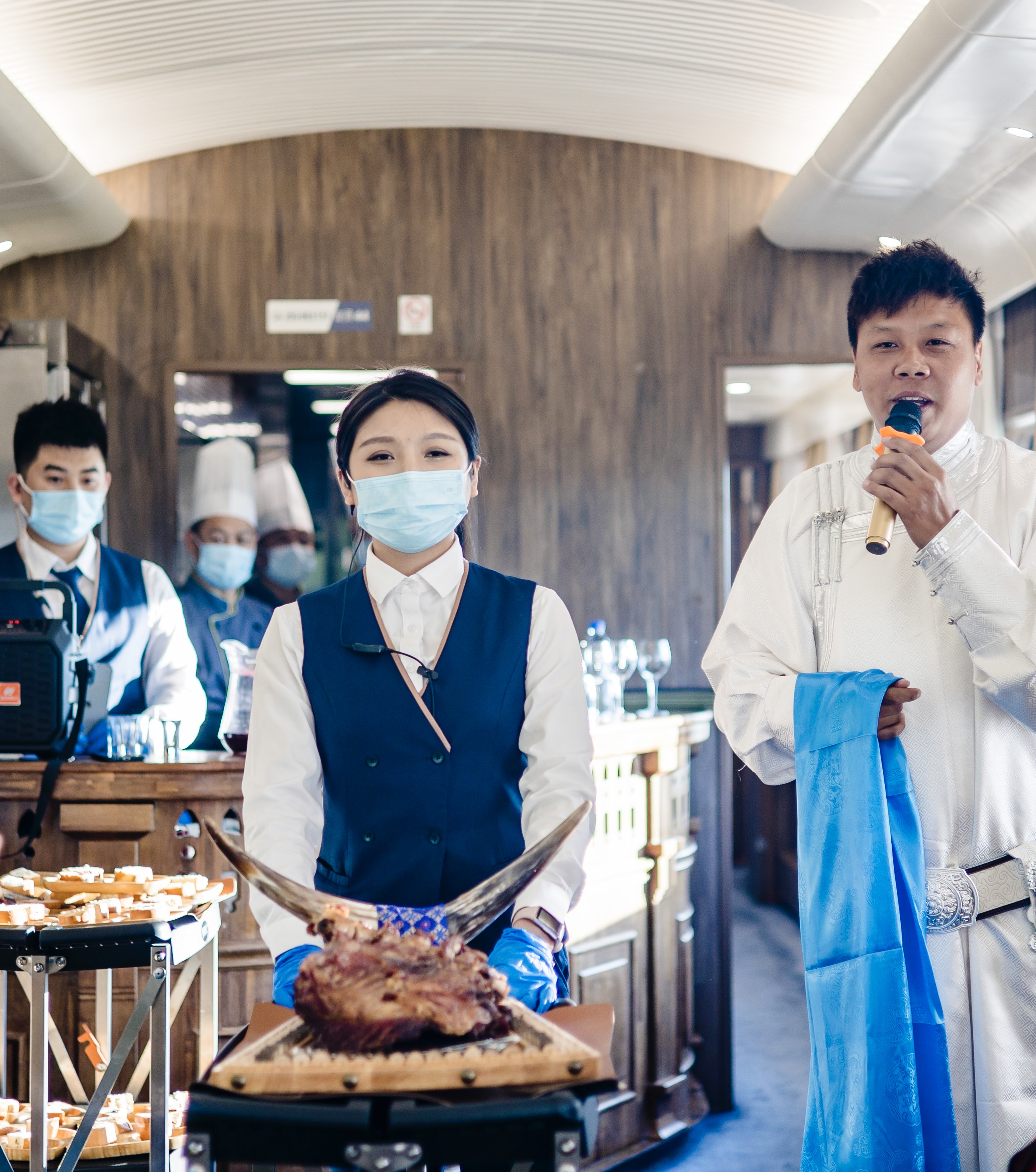 美食自然是是高端旅行火车的重头戏。呼伦贝尔号的餐车名为“巴雅尔”,蒙古语的意思是快乐、高兴、幸福,这里提供每天一套的set menu,涵盖中蒙西式不同风味。前菜、主菜、主食、甜点等几乎日日不重样,并大多选用当季新鲜食材,早餐中松鹤楼苏式汤面的浇头甚至每周从苏州空运而来。餐具同样值得说道,雅绿底色、金色滚边的定制瓷器来自意大利百年名瓷GINORI,这一创立于1735年的意大利家族品牌还出现在多家米其林餐厅、奢华酒店甚至意大利皇室的餐桌上。