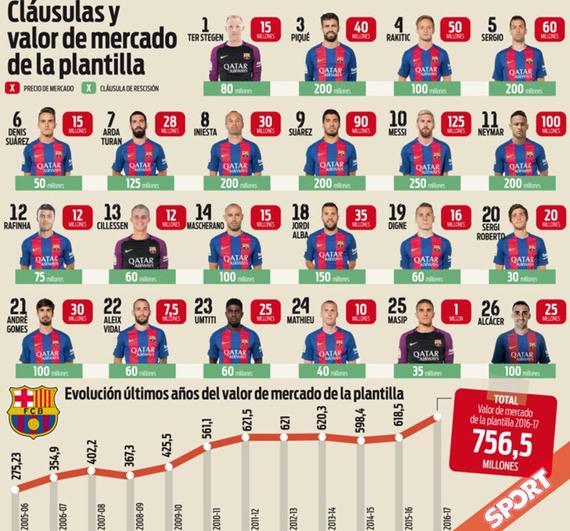 在这样一套壕阵中,首当其冲的自然是当家球星梅西,根据德国《转会市场》提供的保守数据,阿根廷人的市场身价高达1.2亿欧元,队友内马尔的身价高达1亿欧元,苏亚雷斯也有9000万欧元,巴萨仅MSN三叉戟的总价值就达到了3.1亿欧元。要知道在如今愈演愈烈的转会市场,随着“亿元先生”博格巴的横空出世,球员的真实转会身价要远远盖过其市场估值,不少豪门球队为挖角球员甚至不惜触发毁约金条款,而巴萨球员的合同毁约金相加则高达26.65亿欧元,其中梅西依然是最高的,达到2.5亿欧元。