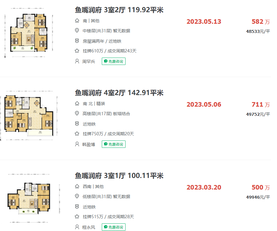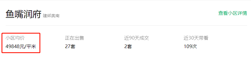 鱼嘴润府,挂牌均价为49848元/㎡,近90天成交2套,二手房成交价在4.7万/㎡-4.9万/㎡之间,近30天带看109次,由此可见该小区还是很受欢迎的。
