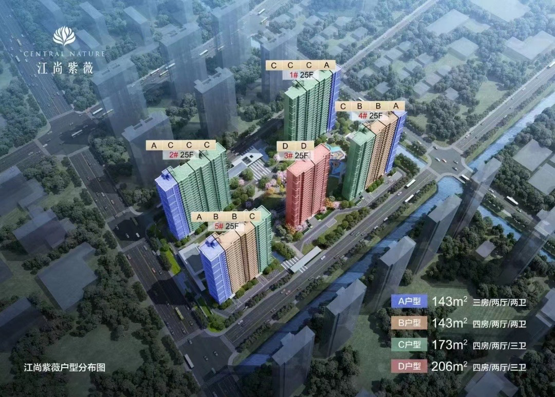 项目位于江心洲南部,由奥体建设独立操盘,共打造5栋25F高层住宅,共约442套房源,户型建面约 143、173、206㎡,部分楼栋一梯一户;外立面采用灰色铝板+金属格栅材料。