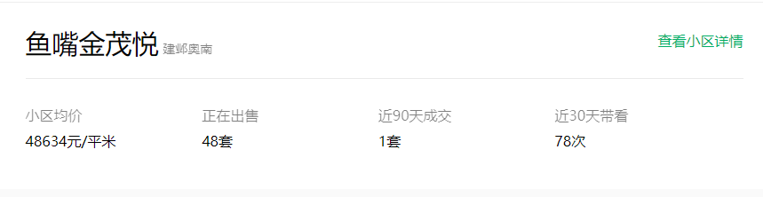 鱼嘴金茂悦,挂牌均价为48634元/㎡,近90天成交1套,二手房成交价在4.8万/㎡-4.9万/㎡之间,近30天带看78次。