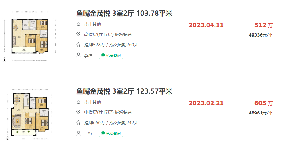 目前,在链家网站上,鱼嘴金茂悦和鱼嘴润府都有不同数量的二手房成交。