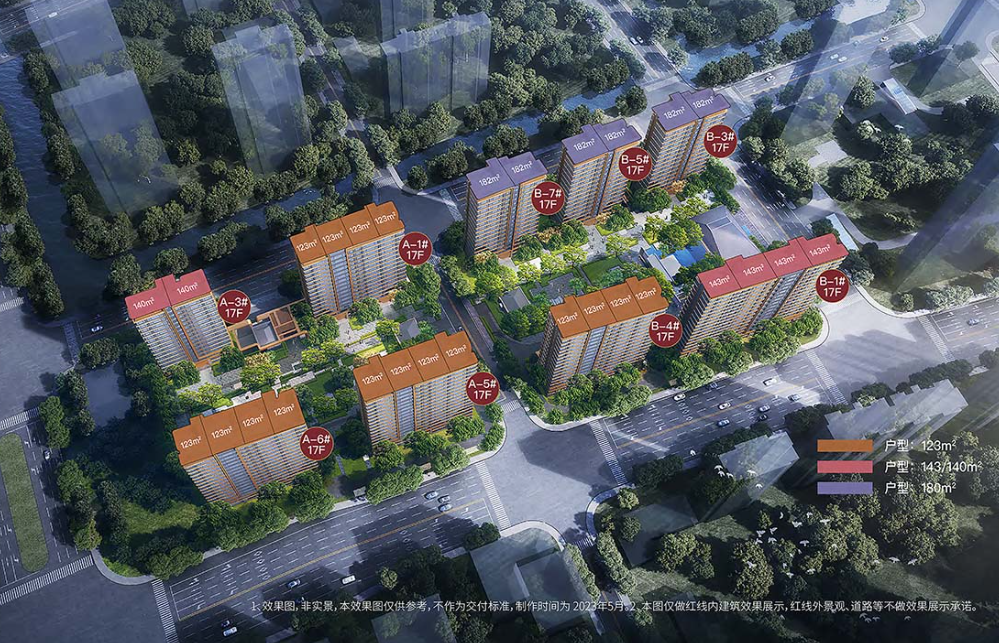 根据规划,项目共打造5栋17层小高层,打造建面约115㎡(三房)、130㎡(三房)、173㎡(四房)三种科技系统户型,全一梯一户式入户。从此前公示的效果图来看,项目外立面采用大面积玻璃,建筑风格现代简约。