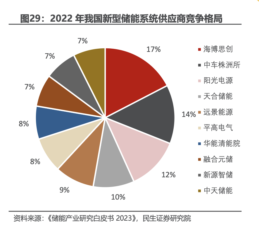 目前,海博思创在新型储能系统中市场份额约17%,市场份额超10%的企业还包括中车株洲所、阳光电源(300274.SZ)以及天合储能。
