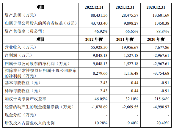公司是一家专注于新能源汽车电子和储能的国家级高新技术企业,是集产品自主研发、生产和销售为一体的国内知名新能源产品供应商,形成了以新能源汽车用动力电池BMS产品为主、储能和其他汽车电子产品为辅的产品体系,是国内最大的第三方BMS提供商。2020年、2021年及2022年公司分别实现营业收入7677.86万元、2亿元、5.59亿元;分别实现归母净利润-2967.61万元、1527.18万元、9048.13万元。