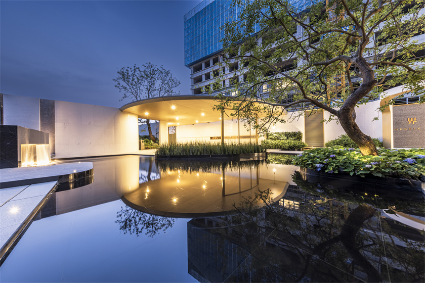 步入水上花园园区会客厅,自然植物与精工艺术的结合,水景铺陈、树木相迎,交织辉映的景观树阵以盛礼迎宾,通过植物精致搭配营造热烈,充满活力的空间氛围,弱化硬景与软景之间的边界感,将绿色与生活融为一体。