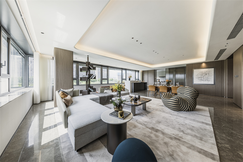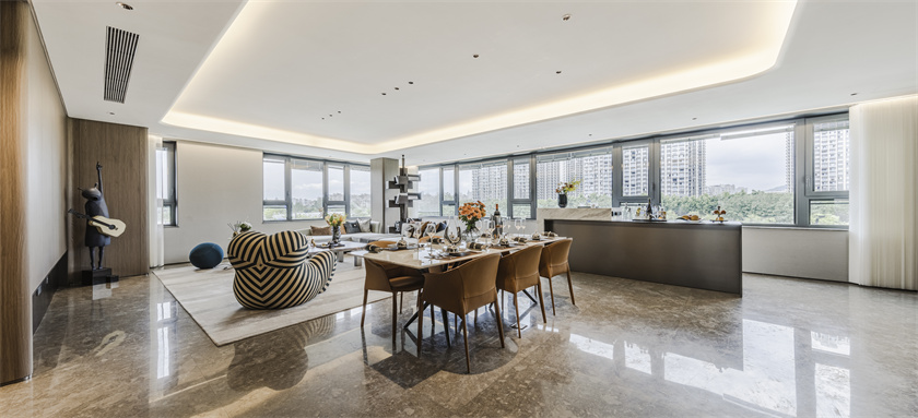 会客厅超大面宽尺寸LDKG多功能空间,会客、起居,生活从容有度,生态跑道阳台,天幕会客的宏大背景,突破边界的居家场景。头等舱尺度营造,营造高定私人行宫,致敬向上人生。