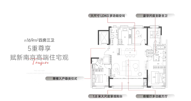 建面约169㎡四房三卫户型:入户为子母门设计,南向长约1.8米双阳台,南向双套房设计,主卧带步入式衣帽间,主卫双台盆同时带有浴缸;北向配置为两间卧室,U型厨房、卫生间。