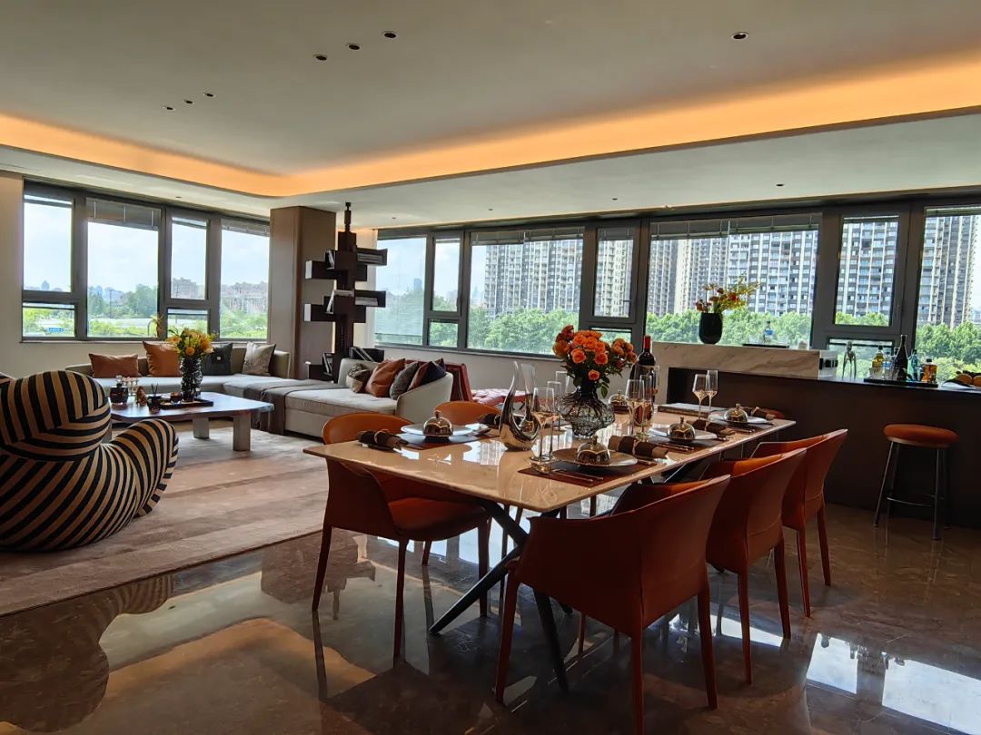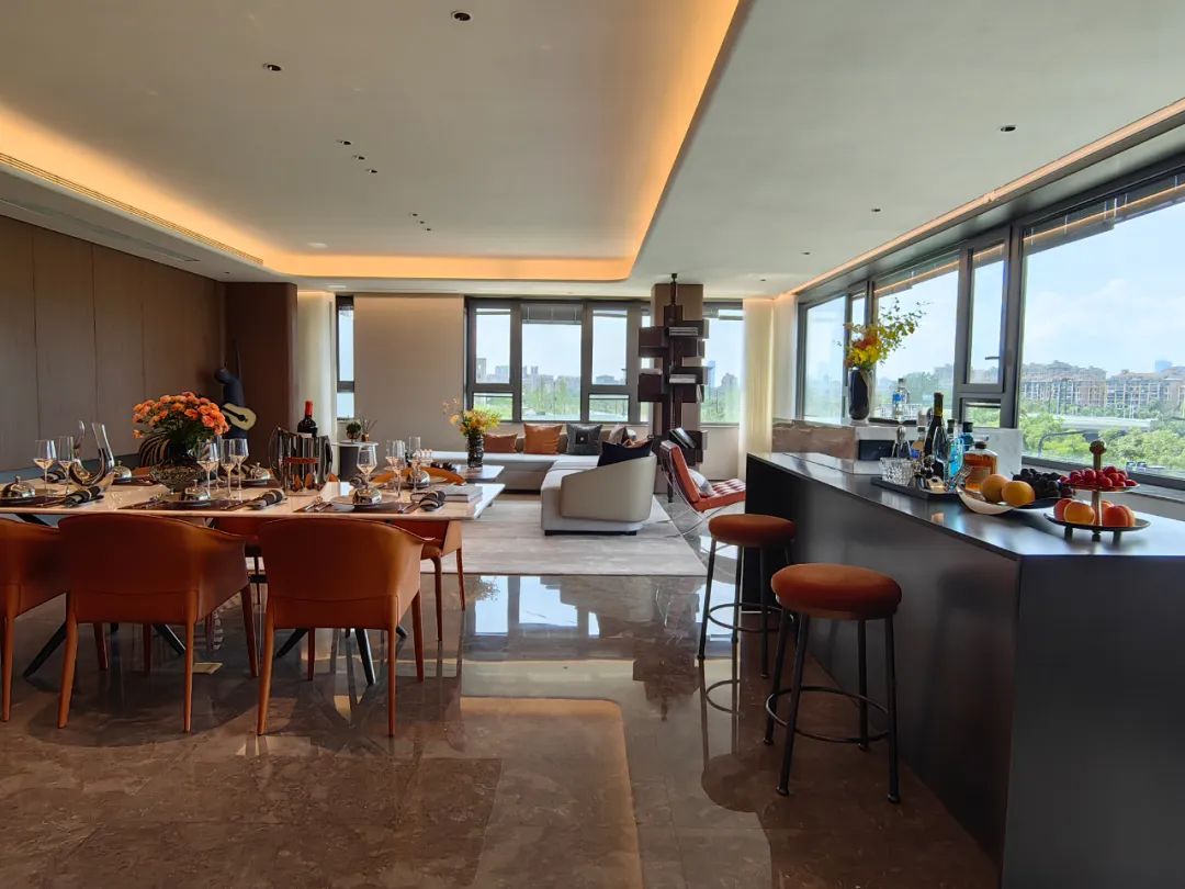 秦淮金茂府在客餐厅采用了进口天然大理石,放眼全南京也非常少见,石纹与光泽感极佳。并且石材之间的拼接达到了相当细的颗粒度,不细看还以为是一面完整的超大石材,视觉效果奢华又震撼。