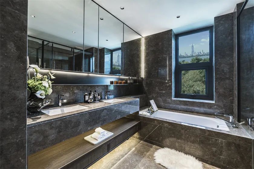 豪华主卫独立艺术浴缸,双台盆设计,超尺度玻璃镜面,奢阔尺度诉说生活的美学语言,散发优雅和精致之美。