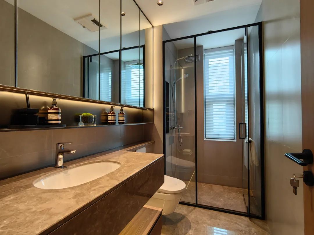 卫生间采用双台盆浴室柜+独立马桶间+独立淋浴+独立浴缸,豪华四分离布局,堪比高奢酒店。