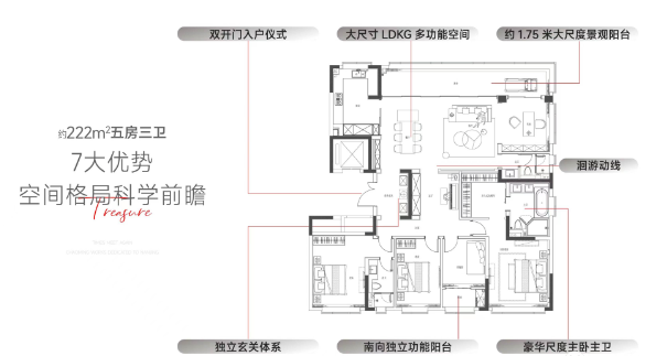 建面约222㎡五房三卫户型:南北双阳台,其中南向三房一卫带独立阳台设计,客餐厅设置在北侧且带约1.75米的大尺度观景阳台;南向主卧带有独立衣帽间,带有双台盆+浴缸等;