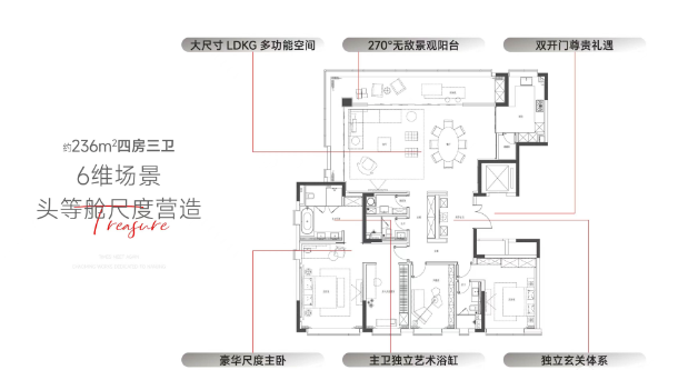 建面约236㎡四房三卫:该户型只配置了四房,空间尺度更加开阔,270°转角阳台,观景视野好;主卧为大套间设计,带有步入式衣帽间、浴缸以及双台盆等;