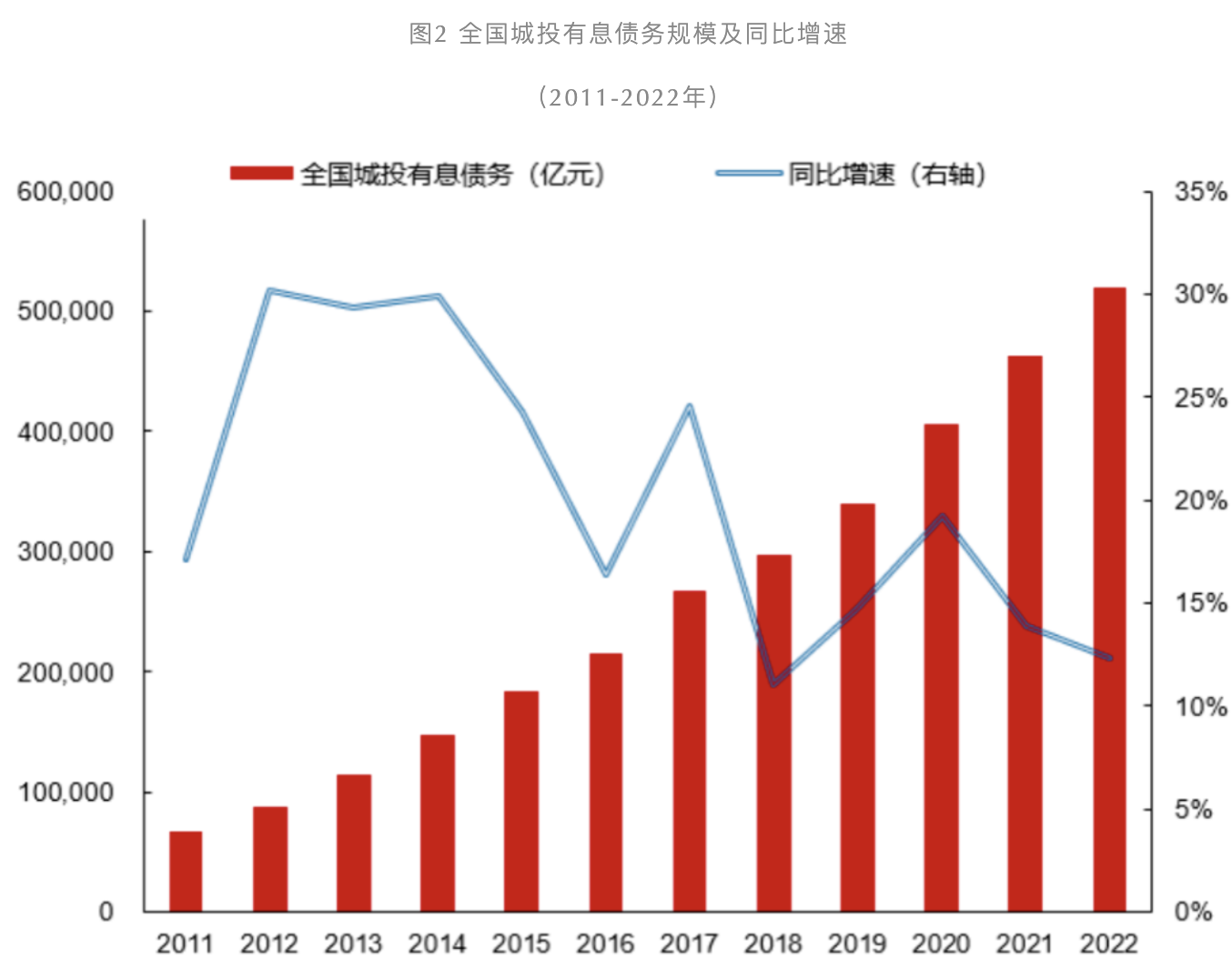 另外,全国城投有息债务规模快速扩张,每年增速均保持在10%以上。2022年末,全国城投有息债务为51.96万亿元,相较2011年的6.8万亿元增长6.7倍。对有息债务的规模和增速我们较难有非常准确的预估,但基于各投资机构的估算,总体规模应该是不小的。