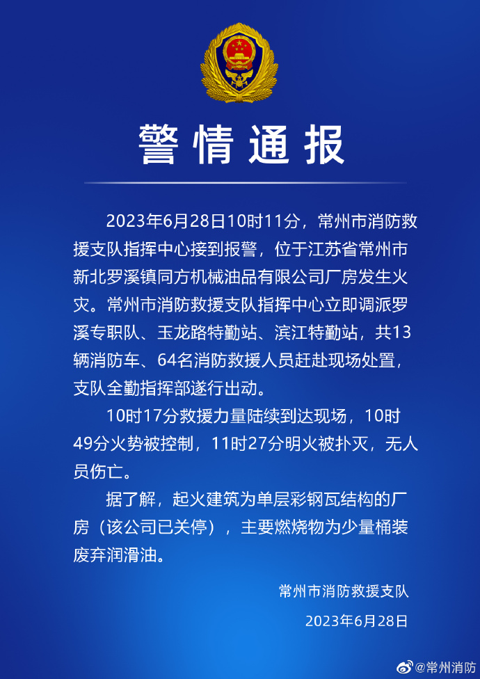 据@常州消防 微博消息,6月28日10时11分,常州市消防救援支队指挥中心接到报警,位于江苏省常州市新北罗溪镇同方机械油品有限公司厂房发生火灾。常州市消防救援支队指挥中心立即调派罗溪专职队、玉龙路特勤站、滨江特勤站,共13辆消防车、64名消防救援人员赶赴现场处置,支队全勤指挥部遂行出动。10时17分救援力量陆续到达现场,10时49分火势被控制,11时27分明火被扑灭,无人员伤亡。据了解,起火建筑为单层彩钢瓦结构的厂房(该公司已关停),主要燃烧物为少量桶装废弃润滑油。
