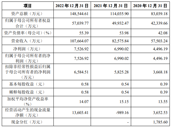 招股书显示,公司主要从事冲压和焊接汽车零部件及相关工装模具的研发、生产和销售。2020年、2021年、2022年,公司实现营业收入分别约为5.75亿元、8.26亿元、10.77亿元,同期实现归属于母公司所有者的净利润分别为4496.19万元、6990.02万元、7526.92万元。
