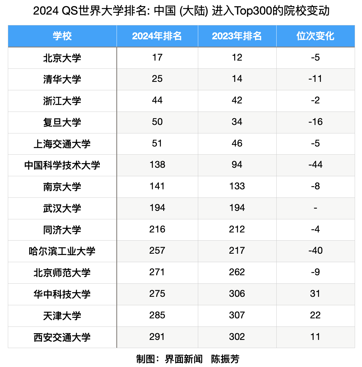 清华大学排名第25位,较去年跌了11名;哈工大排名257,较去年跌了40名,中科大位列138名,较去年跌去44位,较去年跌了2名;复旦大学排名第55位,较去年跌了16名;上海交通大学下滑5名,位列全球第51位。