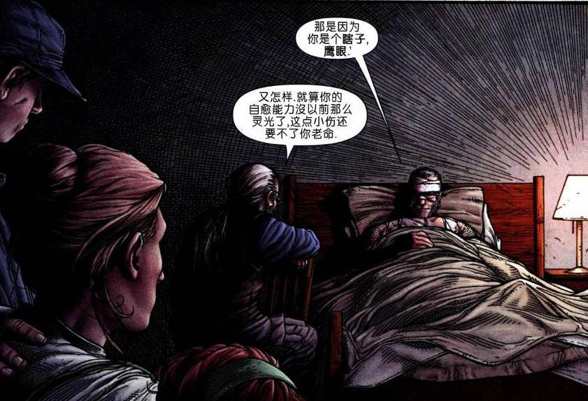 后来,幸存的另一位超级英雄复仇者成员鹰眼,来看望罗根。我们发现鹰眼的眼睛已经瞎了,后来传言他得了青光眼。鹰眼有一个特殊任务,可以理解成押镖,任务要求就是把一个箱子从罗根附近的区域(美国西部),横跨美国运送到美国东部。鹰眼因为眼盲,所以希望罗根帮忙,最终得到的赏金,鹰眼承诺给罗根500美元。如此落魄的罗根,最后还是答应了鹰眼的请求。当然,最后鹰眼发现原来这都是红骷髅的阴谋,这是后话。