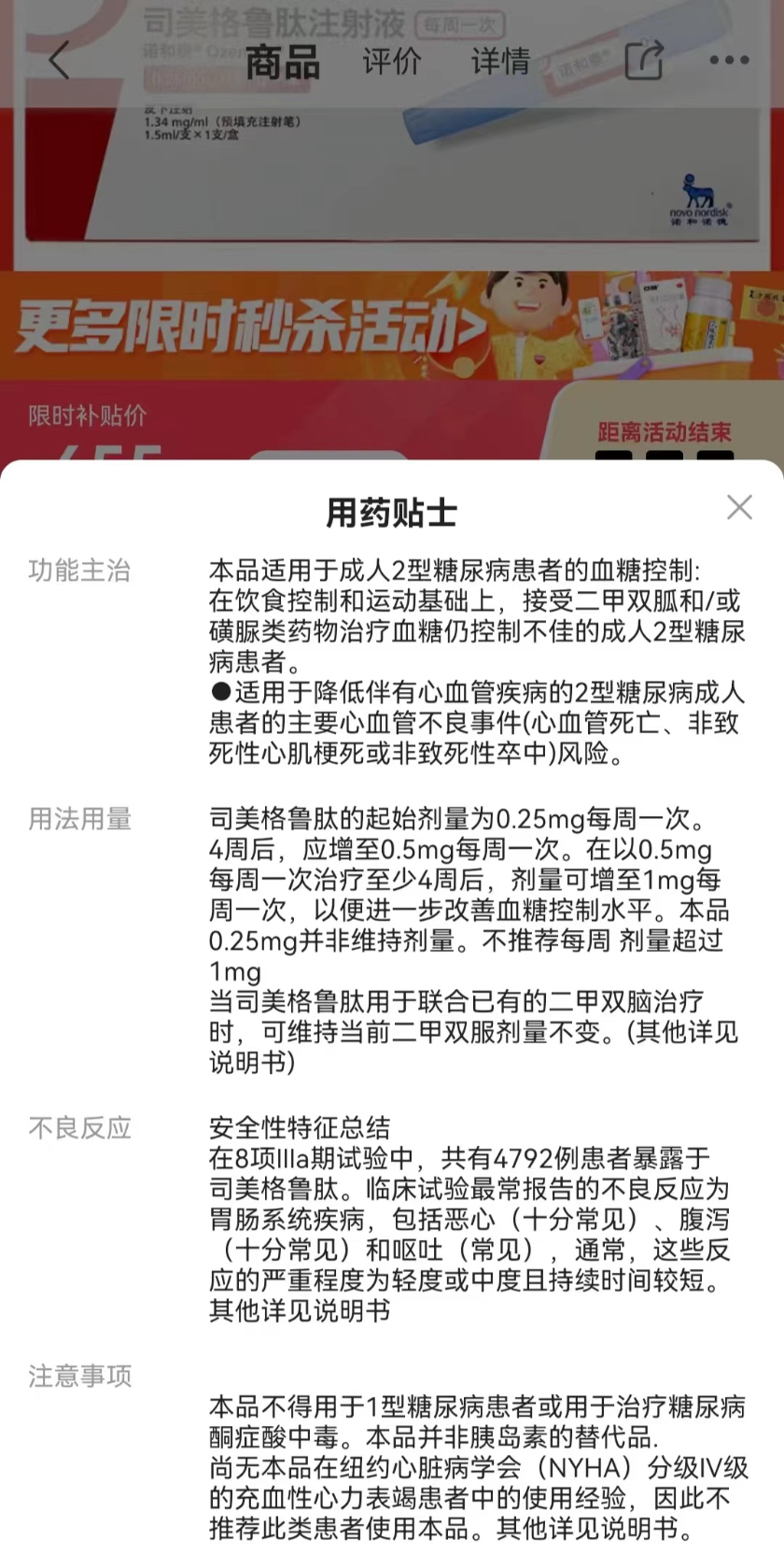 而方舟健客则在展示处方药包装信息的基础上,提供了清晰、具体的用药贴士,包括功能主治、用法用量、不良反应等信息。