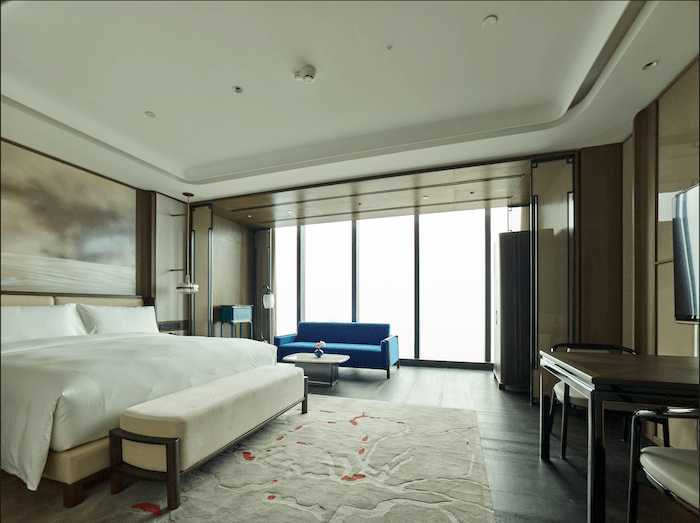 酒店客房是以海洋蓝或夕阳金色主题的房间,采用自动感应系统。客房的家具由Alessandro Munge和他的团队设计,通过对传统细节的提炼和升华,向中式美学致敬。