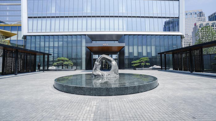青岛钓鱼台酒店入口是由石墙围拢,驶过回字形门廊围拢的车道便可抵达位于一层的接待区。回头看庭院中央是一座景观水台,圆形水台寓意平静、圆满,水台中央陈列名为“千年”的胡杨木。