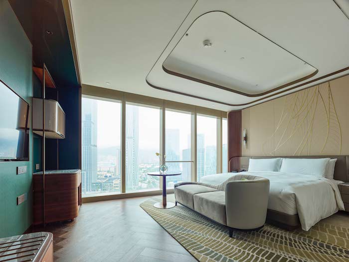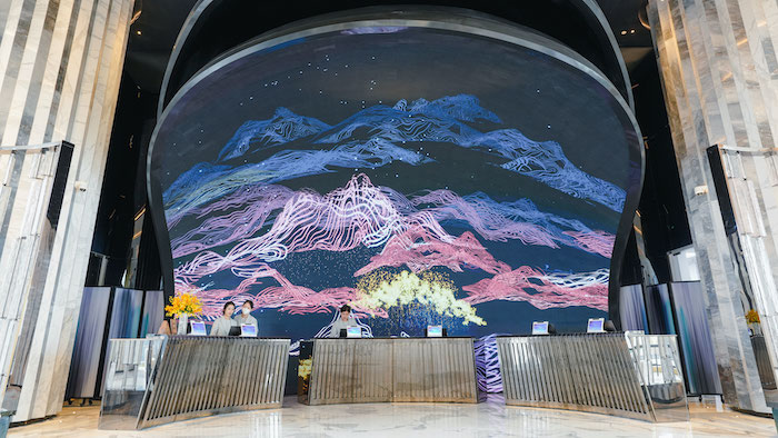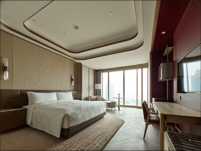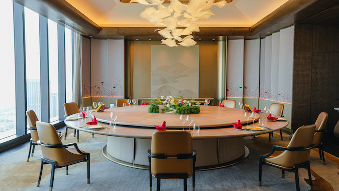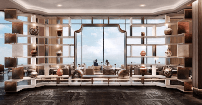 电梯间红色的轿厢中采用了暗红色的真丝刺绣,用瘿木和铜色金属等进行细节点缀。随着“轿厢”门的开启,映入眼帘的是样式丰富的彩绘陶瓷器皿等摆件。空中大堂的窗框采取了中式园林框景的设计理念,宾客的视线随着线条向外延展,将窗外的海天一色尽收眼底。