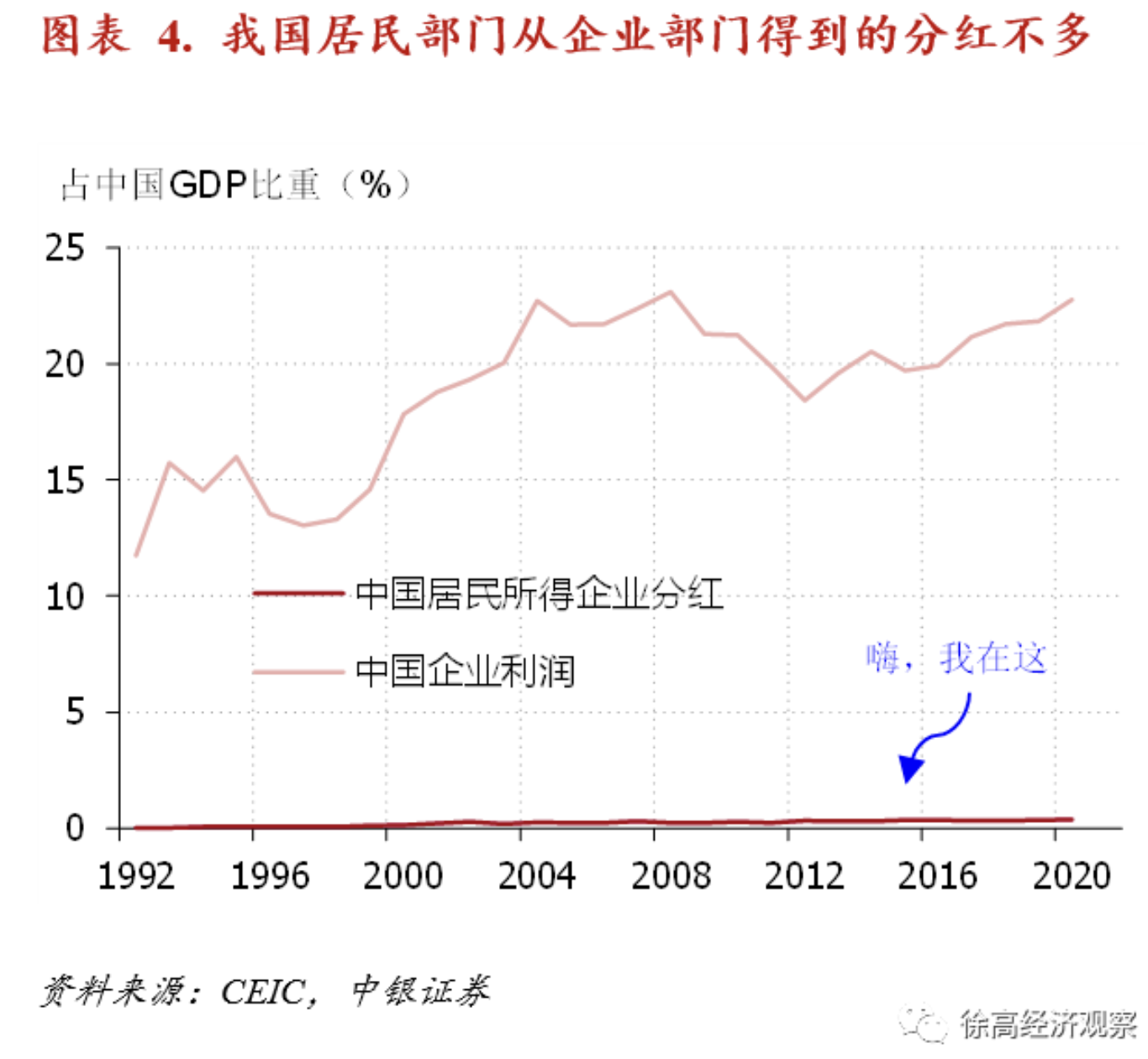 资金流量表的数据也显示,我国居民部门从企业部门得到分红不多。2020年,我国企业部门利润总额为当年我国GDP的22.8%。而同一年,我国居民从企业部门得到的分红总额仅为当年GDP的0.4%,还不到当年企业总利润的2%。事实上,2020年企业向居民的分红还算高的。2019年之前,企业向居民的分红占GDP比重一直低于0.4%。(图表 4)
