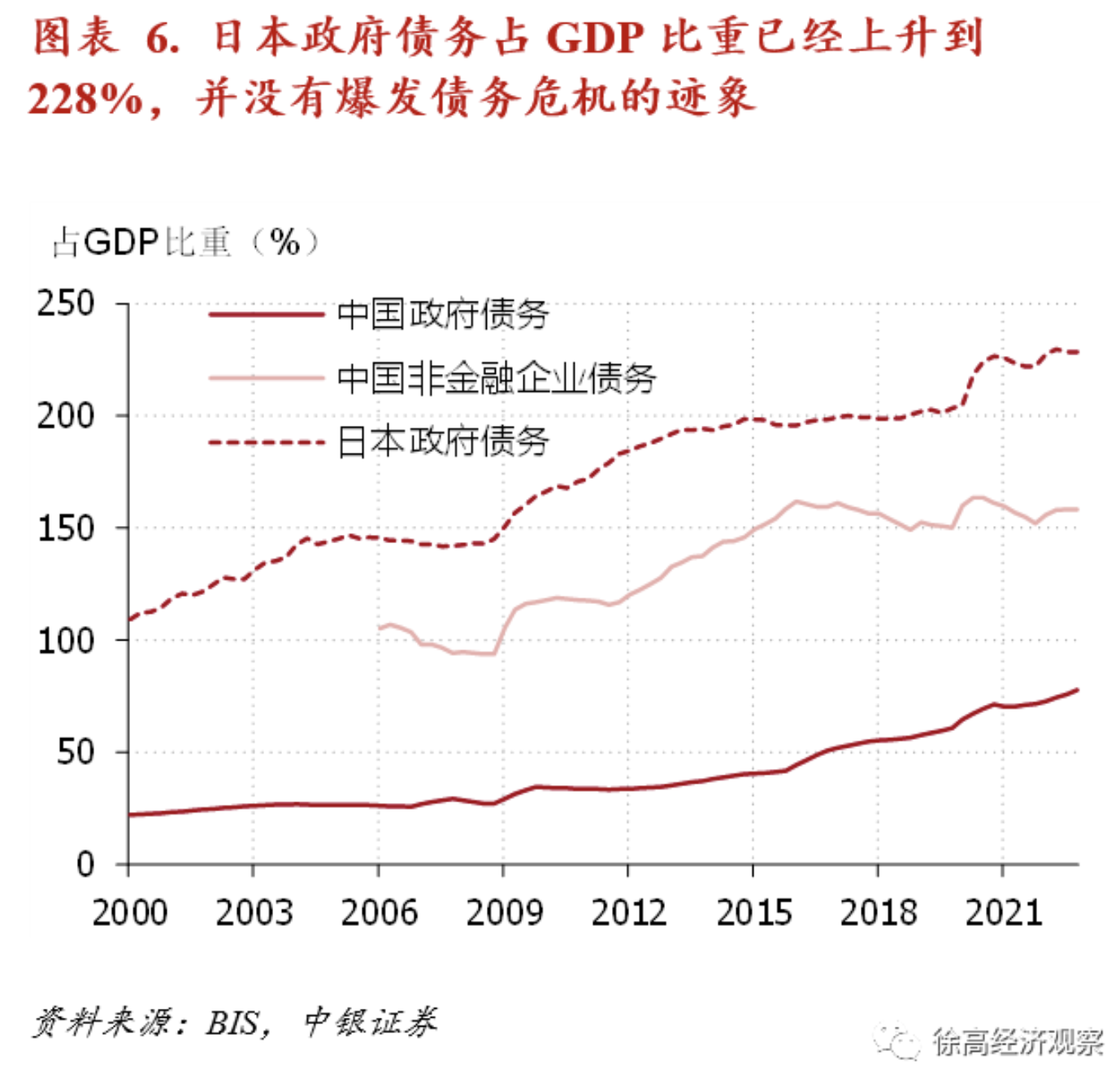 正面的例子是日本。2022年末,日本政府债务占GDP比重已经上升到228%,远高于我国77%的水平,甚至接近了我国政府债务和企业债务总和占GDP的比重。但由于日本国际收支长期健康(长期有经常账户顺差),且通胀长期处于低位,所以日本很高的政府债务水平并未带来什么严重后果,债务可持续性没有问题。(图表6)