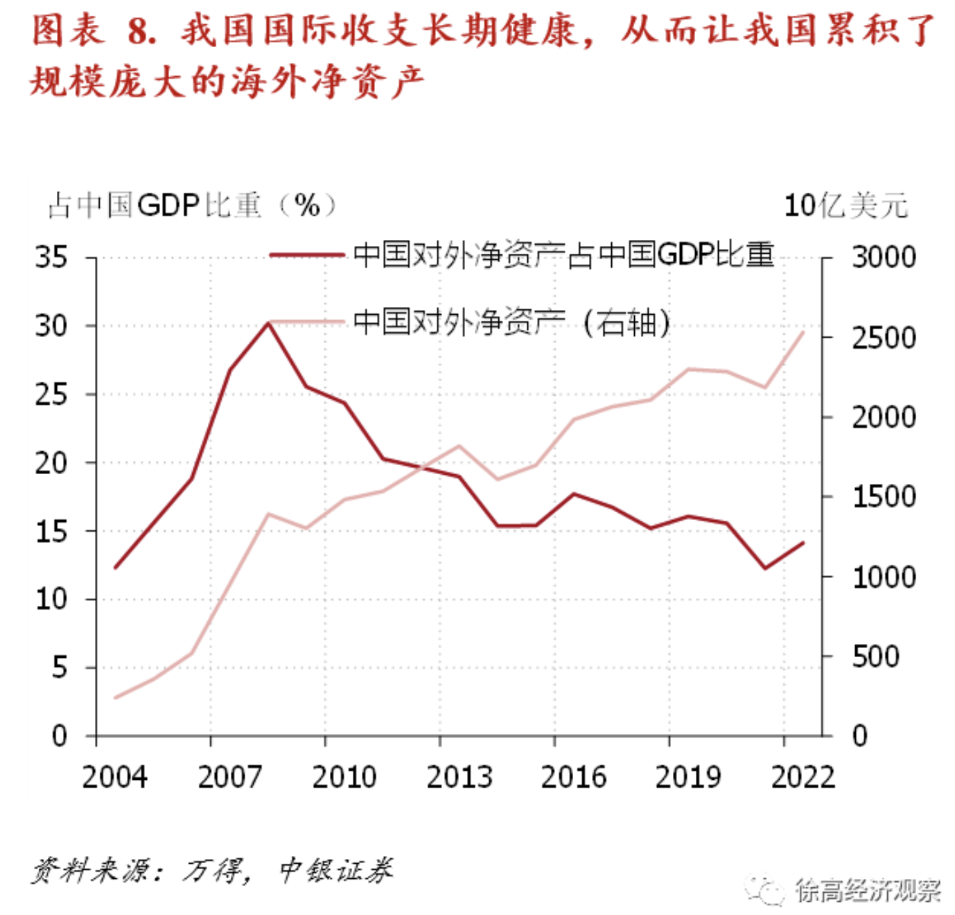 我国的通胀和国际收支约束显然没有收紧。近两年来,我国面临的更多是通缩的压力。而从1994年至今,我国已连续29年录得经常账户顺差。长期的经常账户顺差让我国累积了大量海外资产。国际投资头寸表(IIP)数据显示,2022年我国对外净资产规模(我国持有的海外资产减去我国外债)已上升至2.53万亿美元,是2022年我国GDP的14%。如果有人担心我国债务规模太大了,别忘了我国还向海外净借出了2.53万亿美元。因此,我国政府债务的约束没有收紧,政府在加杠杆方面有很大空间。(图表 8)