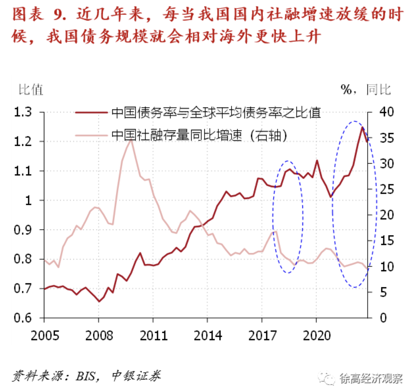 第一、去杠杆政策并未减慢国内债务率的上升速度,反而有推高债务率的倾向。2018-2019年、以及2021-2022年,是我国两波强力去杠杆政策的推进期。在这两段时间里,国内社融增速明显放缓,但同期我国债务率(债务占GDP比重)与全球平均债务率的比值却不降反升,表明在这两段时间里,国内债务率升幅反而更明显地超过国际平均债务率的升幅。事实上,观察过去几年我国债务率和全球债务率的比值数据,可以发现它与我国社融增速负相关,表明去杠杆政策倾向于让国内杠杆率更快上升,放松去杠杆政策反倒有助于减缓国内杠杆率的升势。(图表 9)