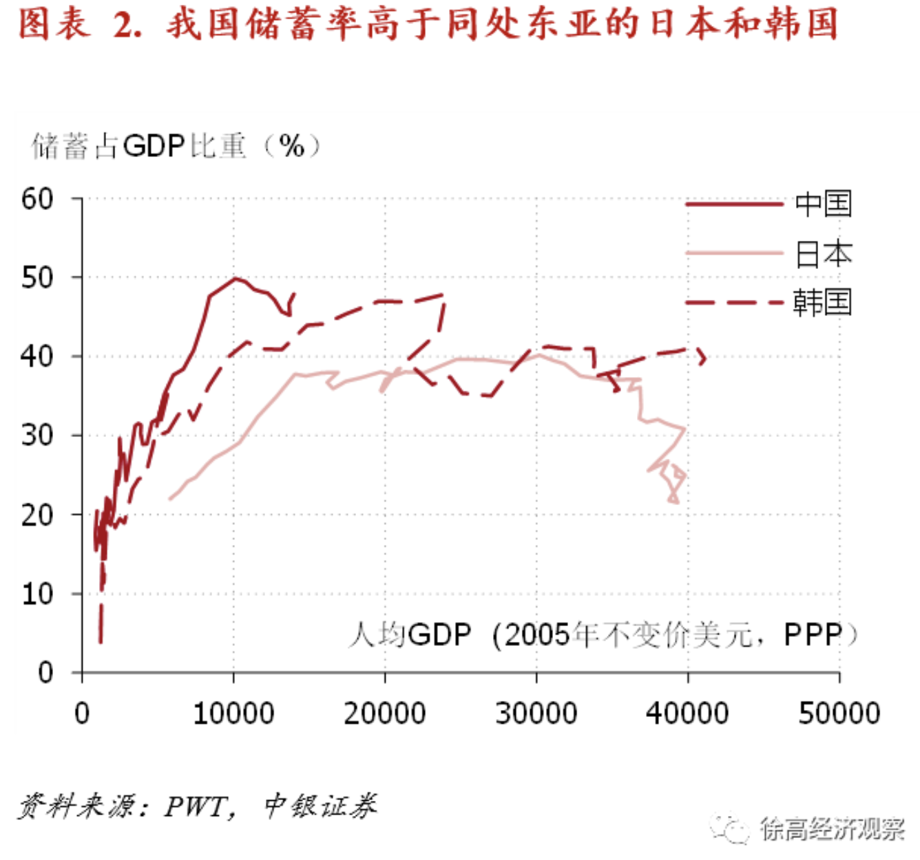中国的债务,必须要放在我国消费不足、储蓄过剩的宏观背景中才能得到完全的理解。我国是一个高储蓄的国家。根据国际货币基金组织的估算,2022年我国国民总储蓄率为46%。这虽然已经低于我国2008年创下的52%的储蓄率峰值,仍然是世界其他国家地区平均储蓄率的差不多两倍。即使把我国放到崇尚节俭的东亚儒教文化圈中对比,我国的储蓄率仍然算高的。对比我国与日本和韩国的发展轨迹,可以发现我国在各个人均GDP水平上,储蓄率基本上都高于日韩在对应人均GDP水平的储蓄率。我国的高储蓄率可能跟崇尚节俭的文化有关,但节俭不是我国高储蓄的唯一原因。(图表 2)