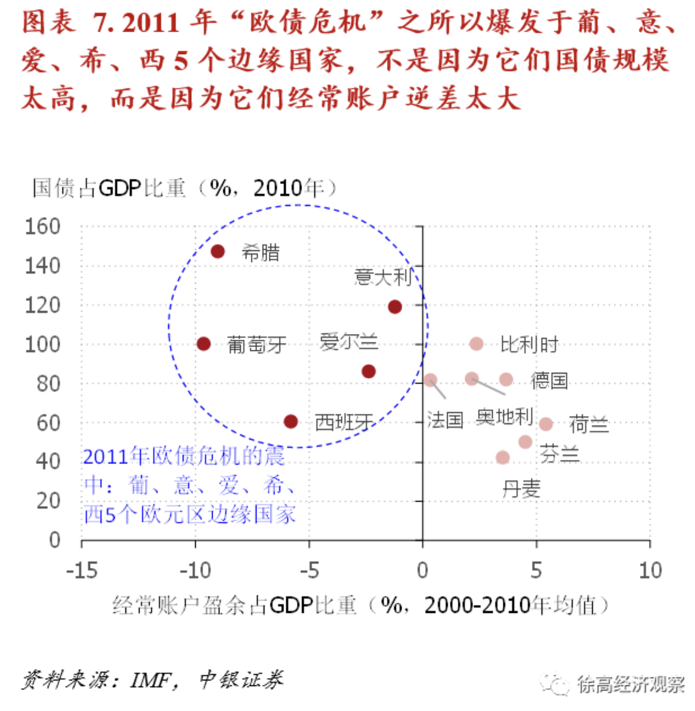 反面的例子是2011年欧债危机的震中,葡萄牙、意大利、爱尔兰、希腊和西班牙这5个欧洲边缘国家。债务危机之所以在这5个国家爆发,并不是因为它们的国债规模太高。事实上,在欧债危机爆发的仅仅一年前,西班牙国债占GDP比重还低于德国。爱尔兰的国债水平也只是与德国相当,并低于比利时。这5个边缘国家爆发债务危机的根本原因,是它们在欧债危机爆发之前的10年里,国际收支长期恶化,长时间有经常账户赤字,以及随之而来的大量外债累积。所以,尽管这5个国家的国债规模并不都很高,但因为它们是欧元区主要国家中经常账户赤字最大的5个,所以欧债危机在它们那里爆发。(图表 7)