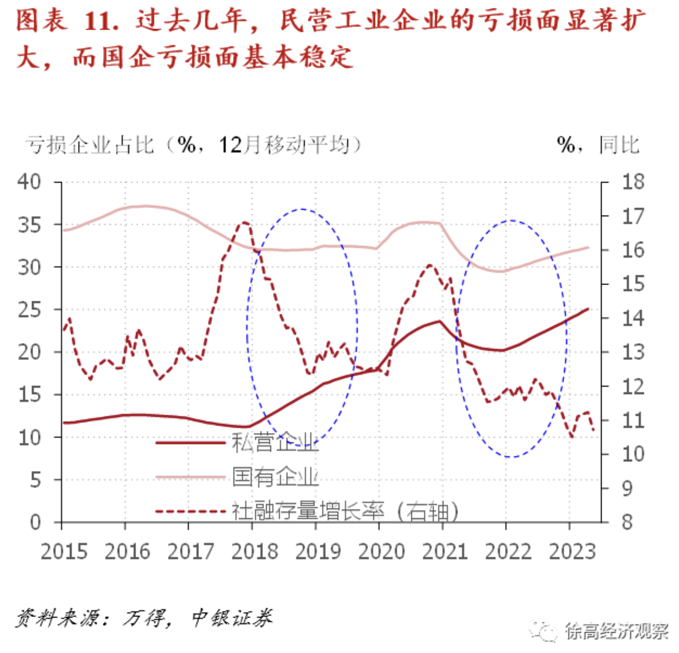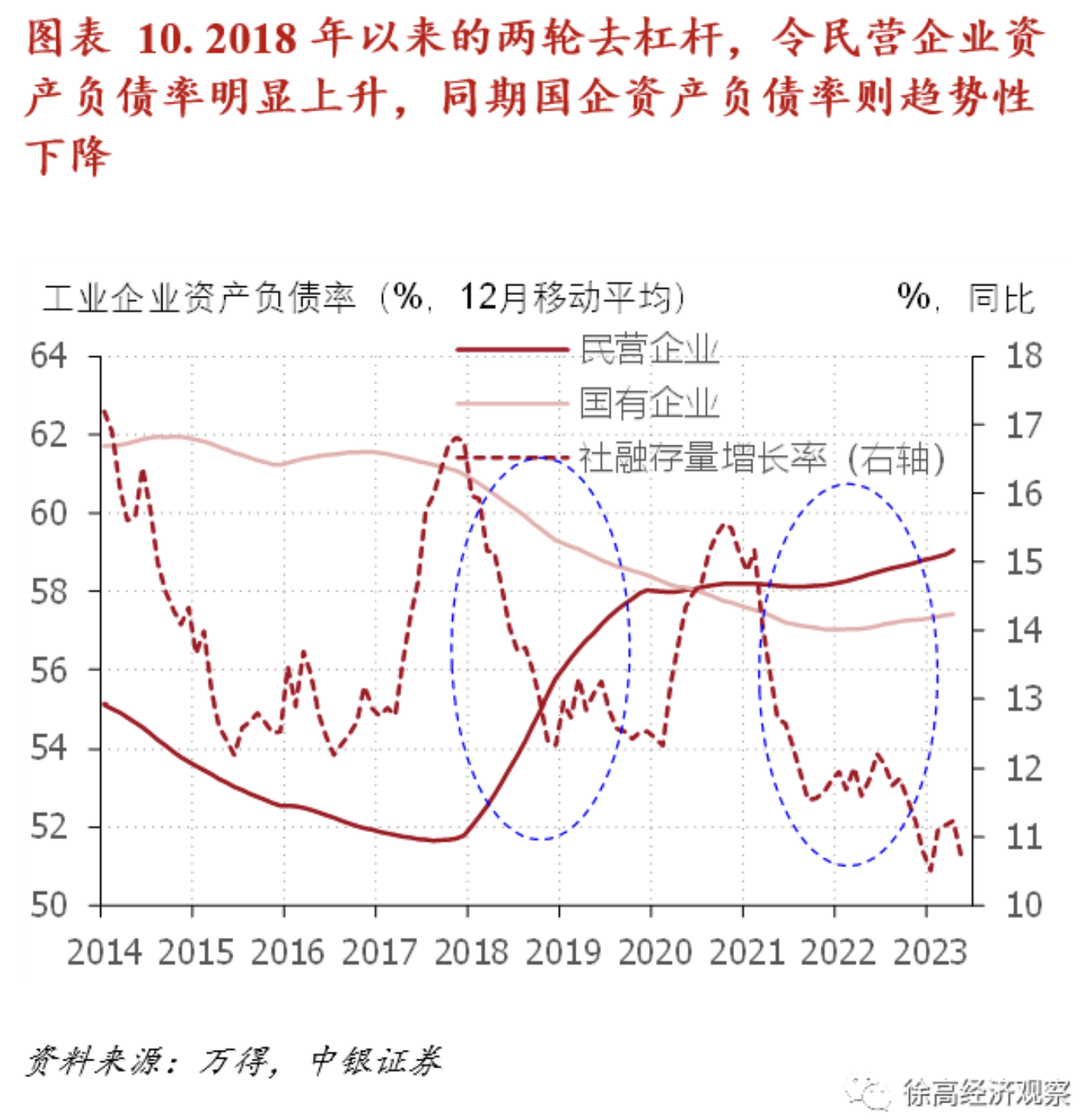 第二、去杠杆政策还更为明显地打击了经济中最具活力的民营部门。在2018-2019年、以及2021-2022年这两段时间里,民营工业企业的资产负债率都在社融增速放缓的同时明显上升。同期国有工业企业资产负债率却有所下降。这是因为相比国企,民企抵御风险的能力更弱。在去杠杆政策带来的融资紧缩、经济下行的环境中,民营企业更难拿到融资,经营情况恶化得更快。(图表 10)