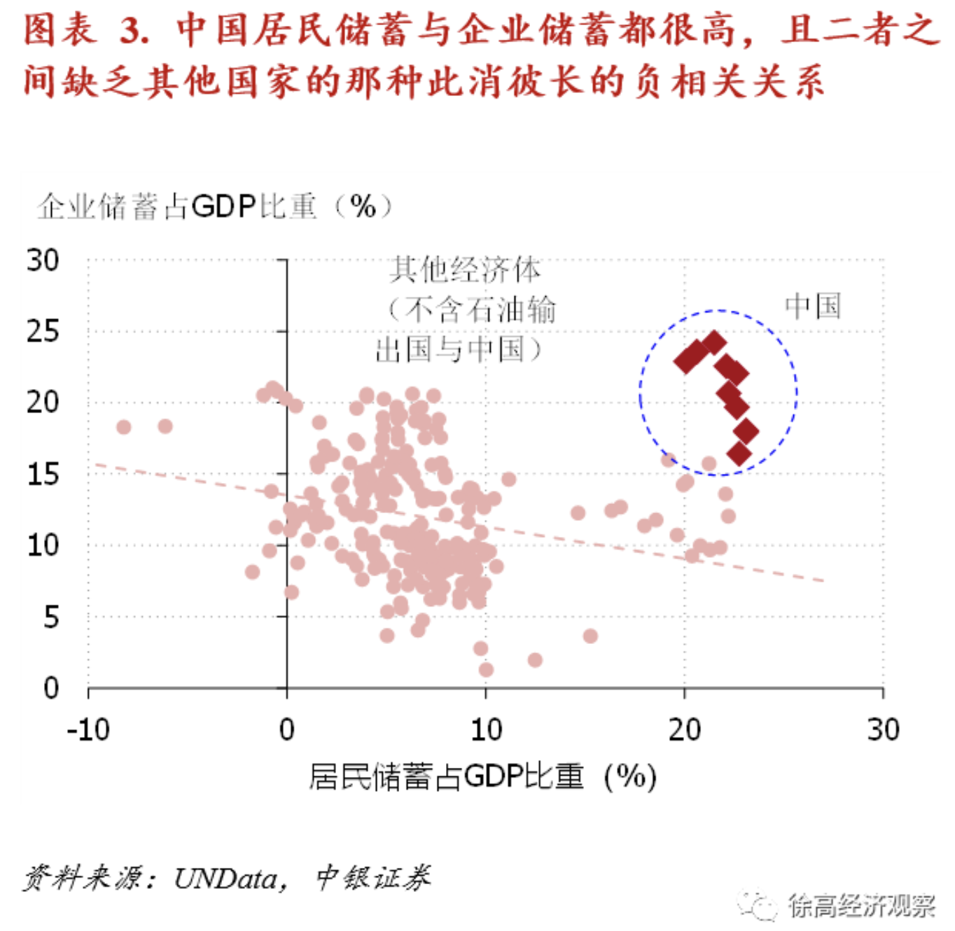 与世界上绝大多数国家不同的是,我国居民储蓄和企业储蓄都很高,且二者之间没有明显的负相关关系。这反映了我国居民和企业两大部门的财富效应联系被割裂。我国企业部门中有相当比例的国有企业,资产归国家所有。而我国民营企业的股权也并不为居民部门较为平均的持有,而是有相当程度的集中度。因此,我国广大老百姓直接持有的企业部门股权其实并不多,普通老百姓通过股权享受到的来自企业部门的财富效应不明显。我国大部分老百姓不会认为企业是在为他们做储蓄,更不会因为企业储蓄的上升而降低自己的个人储蓄。因此,我国居民储蓄和企业储蓄都很高,加起来让国民总储蓄更高。(图表 3)