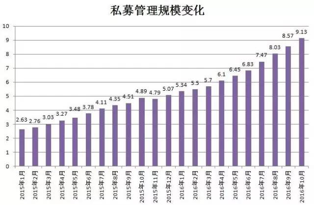 这就是蒸蒸日上的私募行业,最近几个月规模的增长速度基本在每月五千亿左右,到10月底就越过9万亿门槛,达到9.13万亿,这样发展下去,年底10万亿不是梦!按最近两月的增长速度估算,年底也有望突破10万亿。