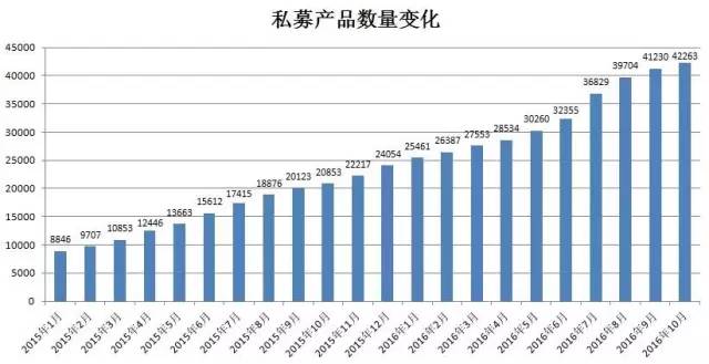 但这丝毫不影响私募产品数量的爆炸式增长。今年初到10月底,协会备案的私募产品已经从2.41万只增长到4.23万只,又是翻了一倍;再放远一点看,从2015年1月到今年10月底,产品数量从0.88万只到了4.23万只,两年不到增长了近4倍,不明觉厉!