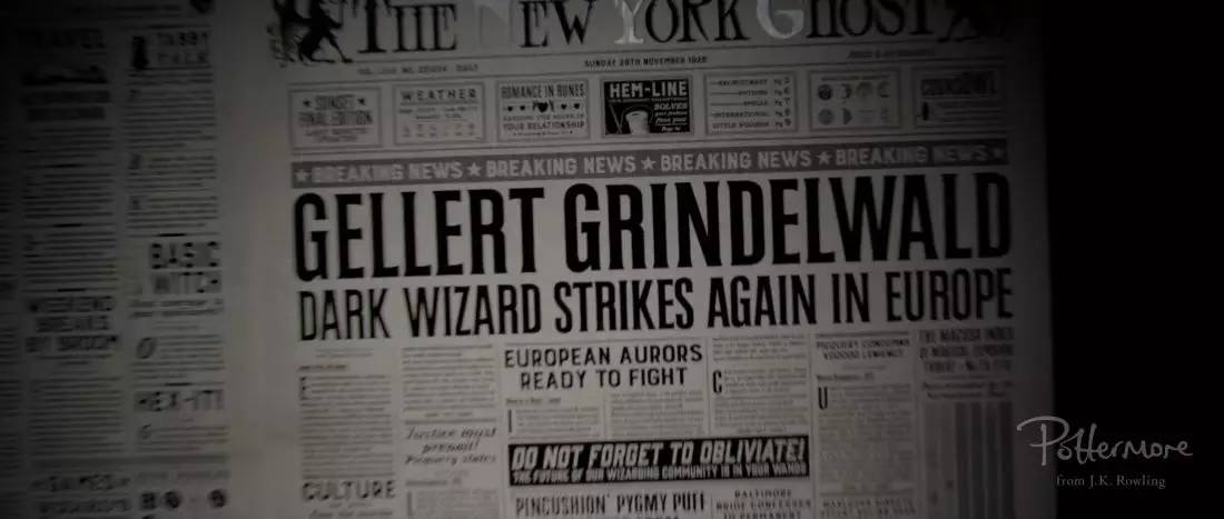 影片里不断地提到一个人的名字“格林德沃”。在开始的报纸上也略到了这个名字的消息。