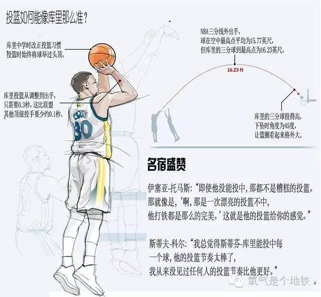 当库里把那些难度极高的三分投丢以后,支持者一声叹息,其他球迷则是在心底庆幸。没错,几乎每个人都在预感库里的出手在很大概率上会命中。名宿“微笑刺客”伊塞亚·托马斯对库里不吝溢美之辞,“即使他没能投中,那都不是糟糕的投篮”,“那是一次漂亮的投篮不中,连打铁都那么完美”。库里的确有这样的本事,出手快,动作稳定,加上弧线高,有时还距离远,这几项堪称科学级的因素共同塑造出这位历史伟大的三分射手。所以, 很少有人能够模仿库里的投篮,从出手到命中率一整套流程。即便姿势达到标准,效果却可能截然相反。