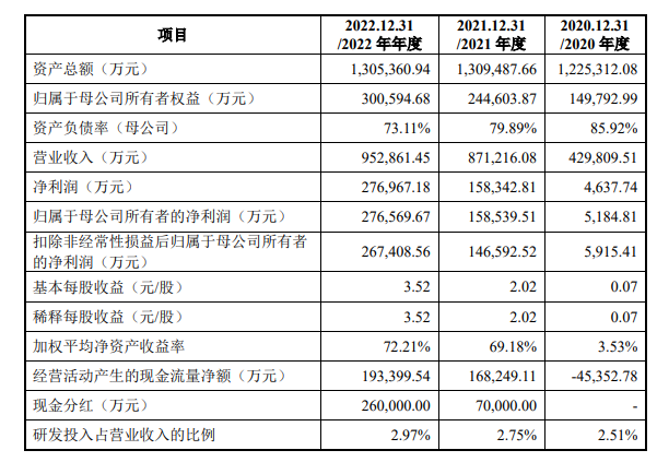 公司是一家集矿产资源开发、基础化学品与精细化学品应用研究开发的全球综合性化学品企业,已经形成了矿产资源、化工中间体、终端化学品的全链条绿色循环产业模式,产品范围涵盖精细化学品和基础化学品。公司于2020年、2021年及2022年分别实现营业收入42.98亿元、87.12亿元、95.29亿元;分别实现归母净利润5184.81万元、15.85亿元及27.66亿元。