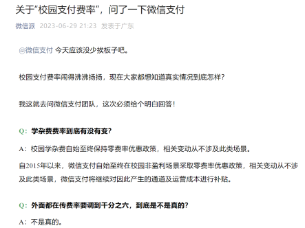 其中,微信支付官方微博于称,自2015年起,微信支付开始进入校园,对于校园内非盈利性支付场景(学杂费、生活服务等)长期给予零费率的优惠政策,持续投入大量成本。针对校园内非盈利性支付场景(学杂费、生活服务等场景)会持续保持零费率的优惠政策。