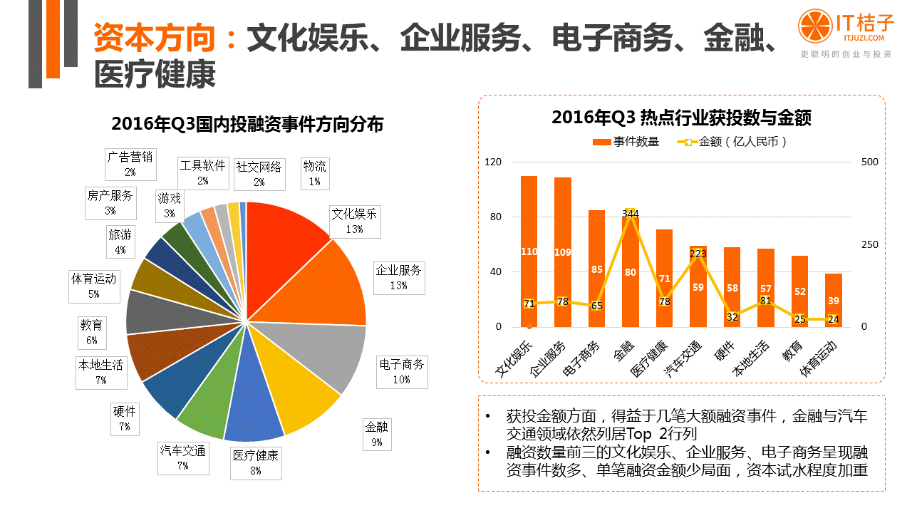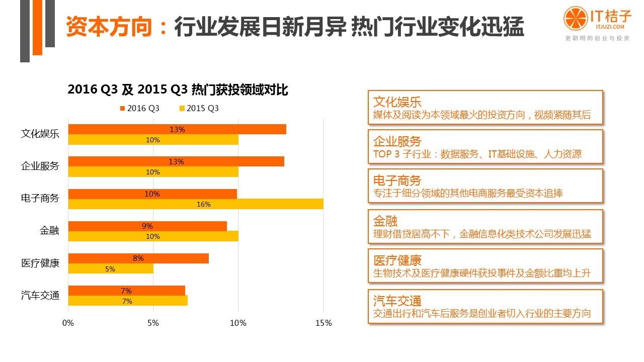 4、Q3 热点领域分析—文化娱乐、企业服务、电子商务、本地生活、金融、医疗健康、汽车交通
