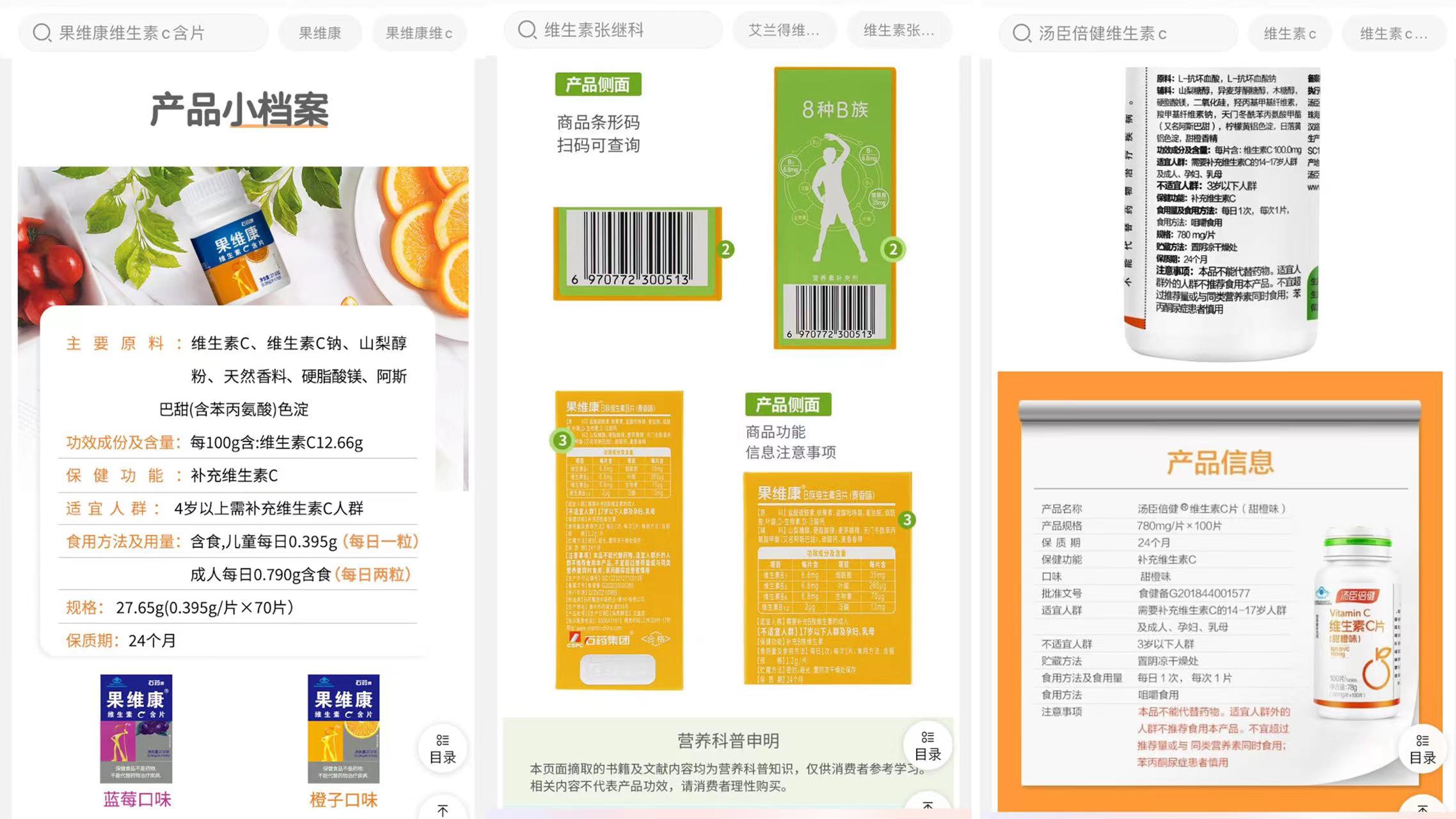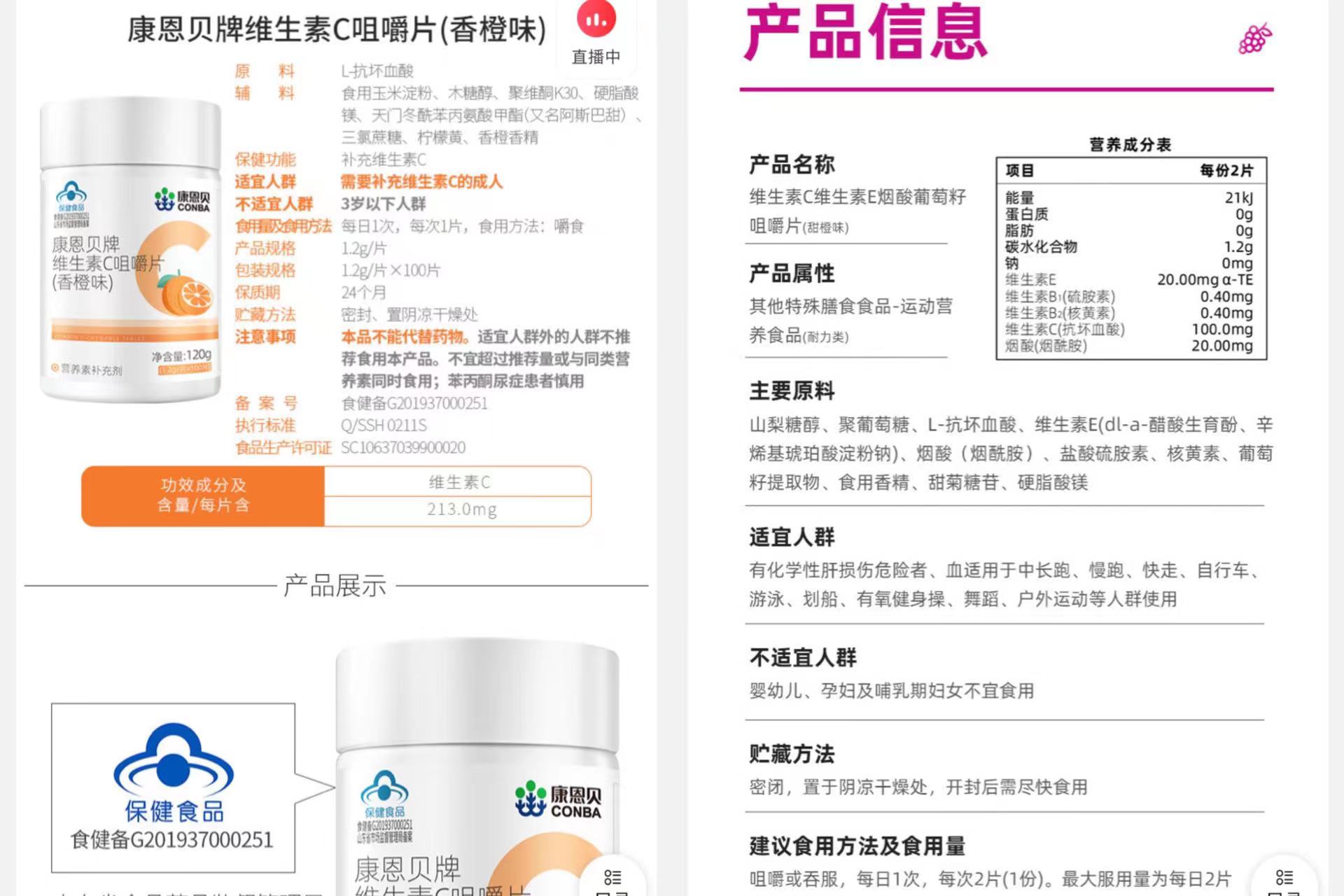 当前,在电商平台的产品详情页,果维康品牌相关的维生素C含片和B族维生素含片产品成分表中,含有阿斯巴甜。