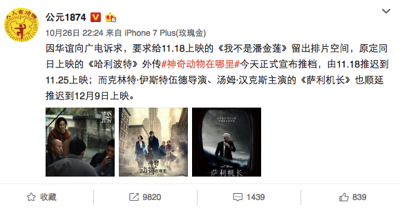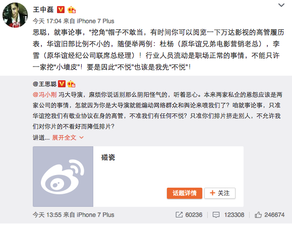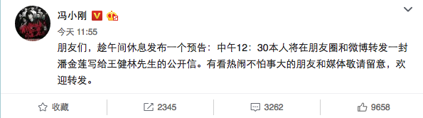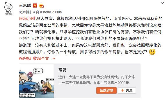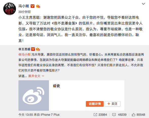 11月18日,在冯小刚因疑万达影院“封杀”《我不是潘金莲》而向万达集团总裁王健林发出公开信后,身为万达院线股东的王思聪(万达院线实控人王健林之子)也进行了回击。