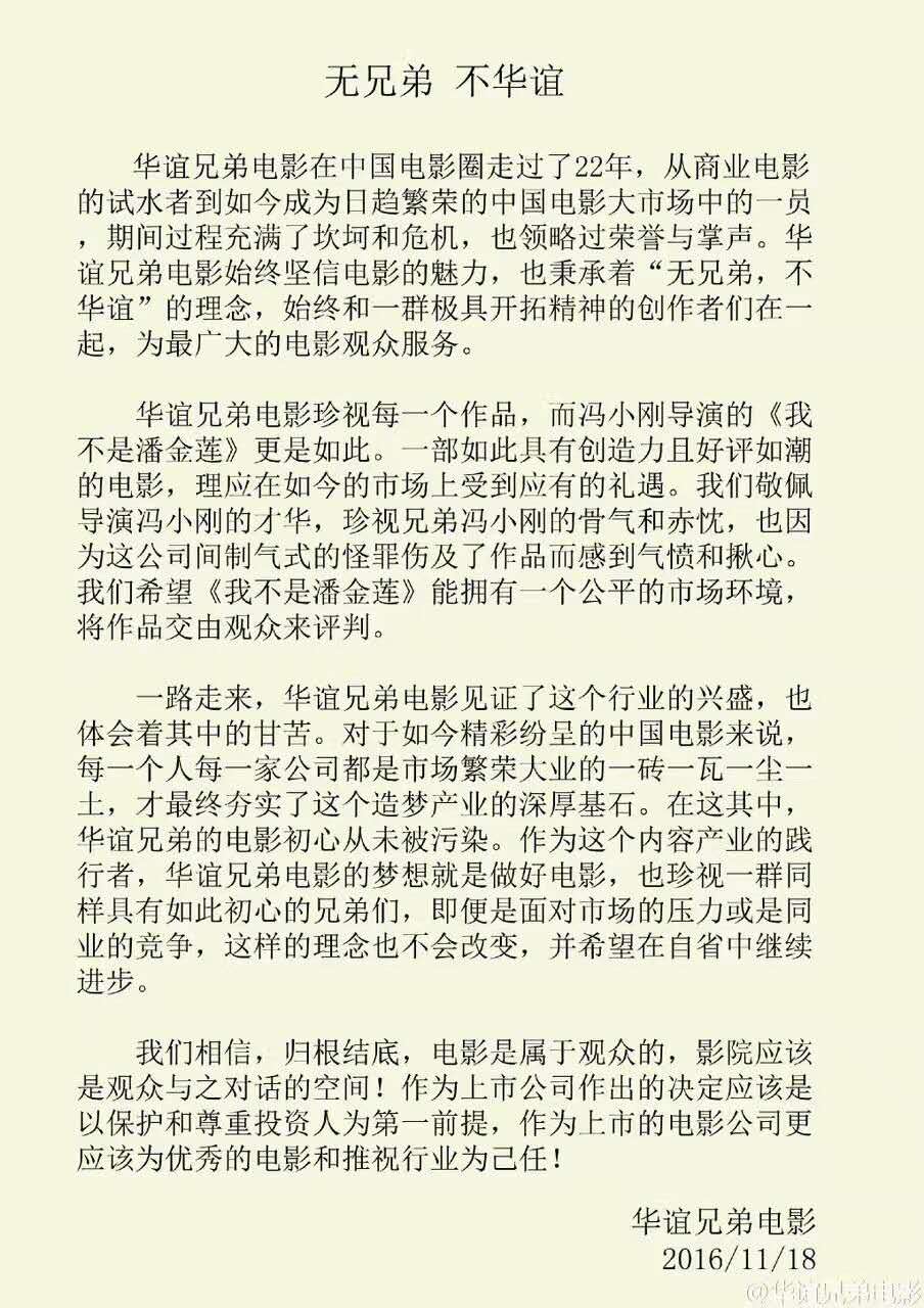 此后,华谊兄弟也发布官方声明,表示“电影是属于观众的,影院应该是观众与之对话的空间!作为上市公司作出的决定应该是以保护和尊重投资人为第一前提,作为上市公司的电影公司更应该为优秀的电影和推祝行业为己任!”似有意指出,作为上市公司的万达院线压低《我不是潘金莲》排片的动作,损害了投资人利益。