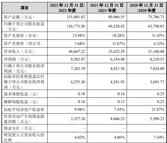 公司是一家以生物分析、药物分析为核心的医药研发外包服务提供商,致力于为全球制药企业提供高质量、高效率的临床前DMPK、临床阶段生物分析、数据管理与统计分析及药学研究(CMC)的全流程、一体化服务。公司于2020年、2021年及2022年分别实现营业收入2.12亿元、3.56亿元、4.67亿元;分别实现归母净利润7824.8万元、4921.54万元、7283.19万元。报告期内,公司综合毛利率分别为48.39%、42.38%及43.94%。