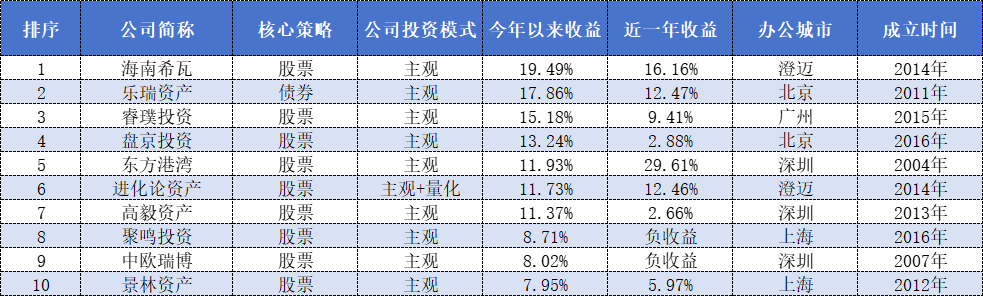 其中,海南希瓦以高达19.49%的收益率排名第一。海南希瓦成立于2014年12月,公司实际控制人、首席投资官梁宏曾从事美股职业交易员6年,并在美股、港股、A股三地有15年以上的投资经验。值得一提的是,除了海南希瓦以外,梁宏担任实际控制人的上海希瓦私募目前管理规模也高达50-100亿元。