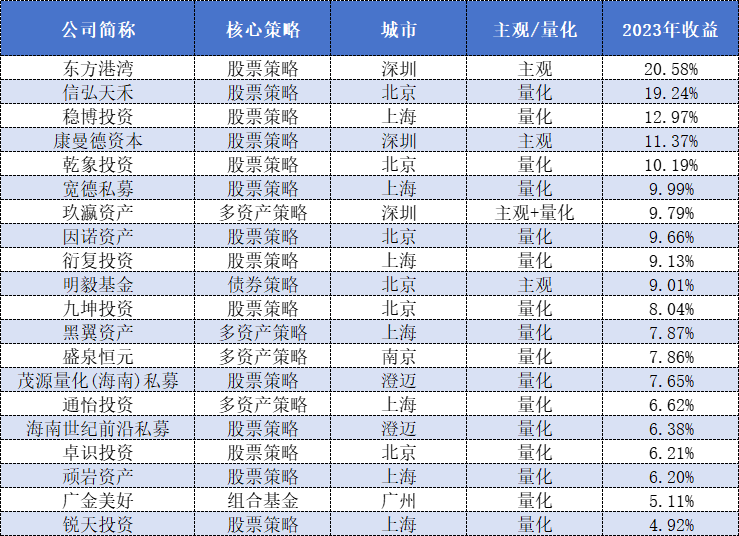 值得一提的是,2023年百亿私募收益前10榜单中,量化私募占据了多达6个席位,主观私募仅占3席位,另有排名第七的玖瀛资产核心策略为主观+量化策略。同时,2023年百亿私募收益榜单第11至20位全部由量化私募占据。