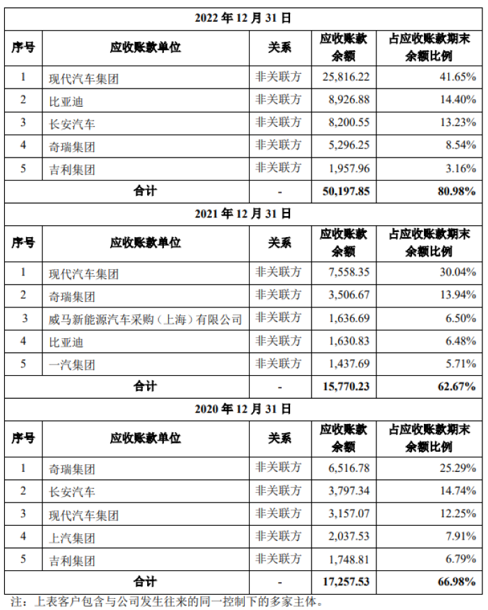 报告期各期末,公司应收账款余额前五名合计分别为1.73亿元、1.58亿元和5.02亿元,占应收账款期末余额的比例分别为66.98%、62.67%和80.98%。报告期内,现代汽车集团应收账款余额占天有为应收账款期末余额比例分别为12.25%、30.04%及41.65%。