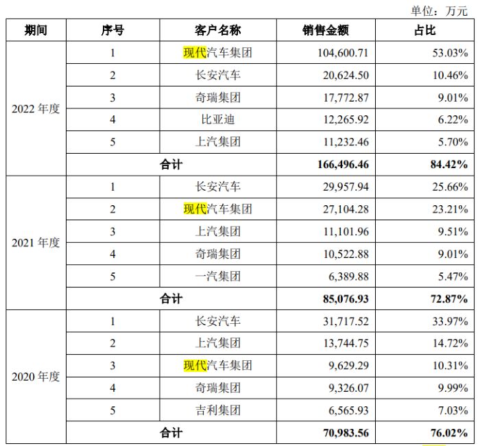 报告期内,天有为向前五大客户销售金额占营业收入的比例分别为76.02%、72.87%和 84.42%,向现代汽车集团的销售金额占营业收入的比例分别为10.31%、23.21%和53.03%,公司客户集中度相对较高,特别是2022年度向现代汽车集团的销售占比超过50%,公司对现代汽车集团存在重大依赖。