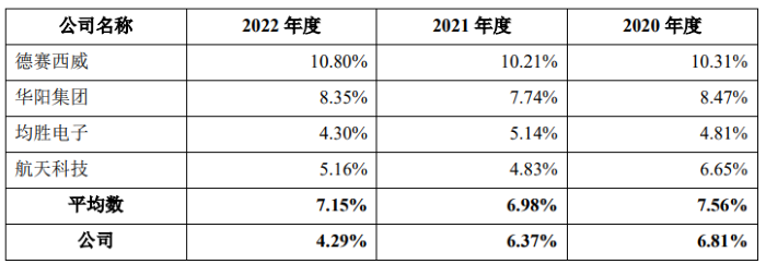对比2022年度研发费用,德赛西威研发费用占收入比重的10.80%,华阳集团研发费用占收入比重的8.35%,航天科技研发费用占收入比重的5.16%,而天有为2022年度研发费用仅占收入比重的4.29%。